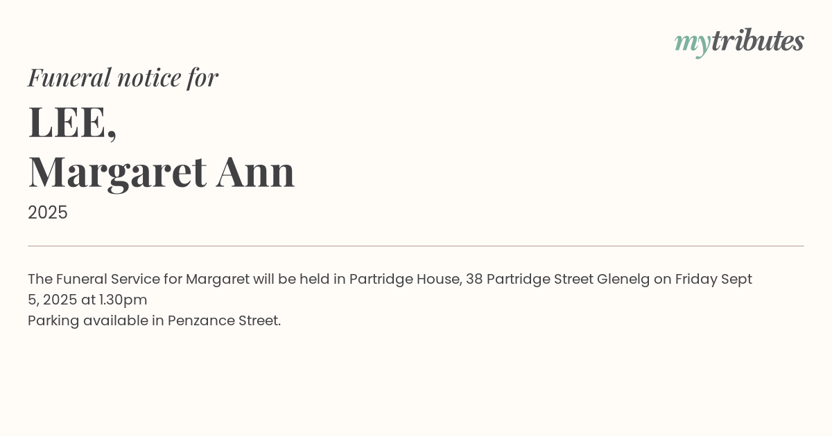 18°CThe Funeral Service for Margaret will be held in Partridge House, 38 Partridge Street Glenelg on Friday Sept 5, 2025 at 1.30pm