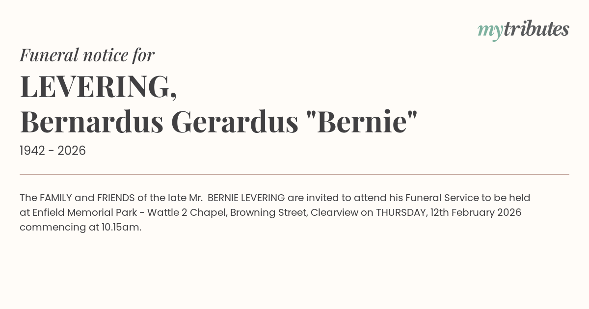 18°CThe FAMILY and FRIENDS of the late Mr. BERNIE LEVERING are invited to attend his Funeral Service to be held at Enfield Memorial Park - Wattle 2 Chapel, Browning Street, Clearview on THURSDAY, 12th February 2026 commencing at 10.15am.