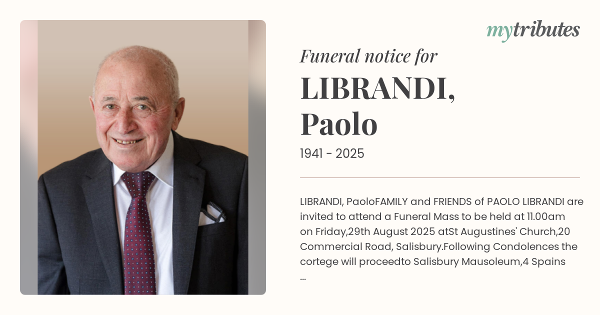 FAMILY and FRIENDS of PAOLO LIBRANDI are invited to attend a Funeral Mass to be held at 11.00am on Friday,