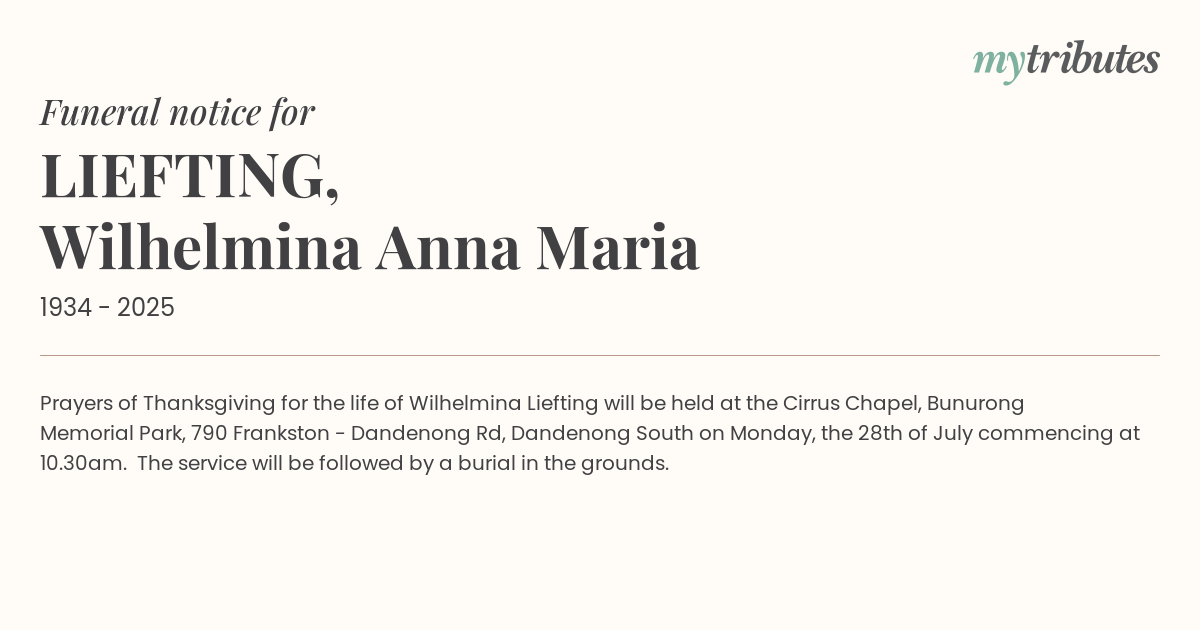 18°CPrayers of Thanksgiving for the life of Wilhelmina Liefting will be held at the Cirrus Chapel, Bunurong Memorial Park, 790 Frankston - Dandenong Rd, Dandenong South on Monday, the 28th of July commencing at 10.30am. The service will be followed by a burial in the grounds.