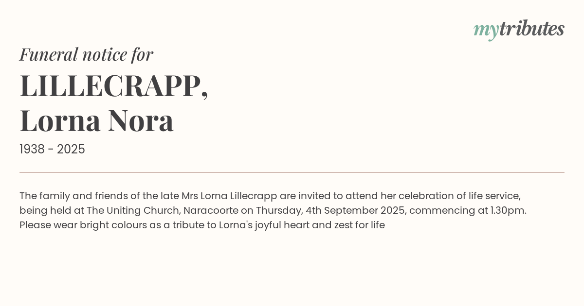18°CThe family and friends of the late Mrs Lorna Lillecrapp are invited to attend her celebration of life service, being held at The Uniting Church, Naracoorte on Thursday, 4th September 2025, commencing at 1.30pm.