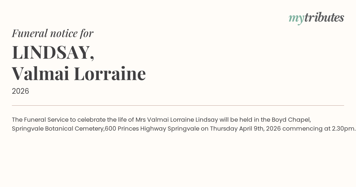 18°CThe Funeral Service to celebrate the life of Mrs Valmai Lorraine Lindsay will be held in the Boyd Chapel, Springvale Botanical Cemetery,600 Princes Highway Springvale on Thursday April 9th, 2026 commencing at 2.30pm.