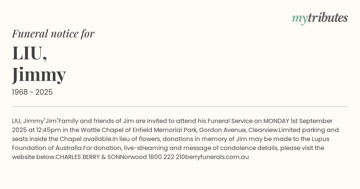 In lieu of flowers, donations in memory of Jim may be made to the Lupus Foundation of Australia.