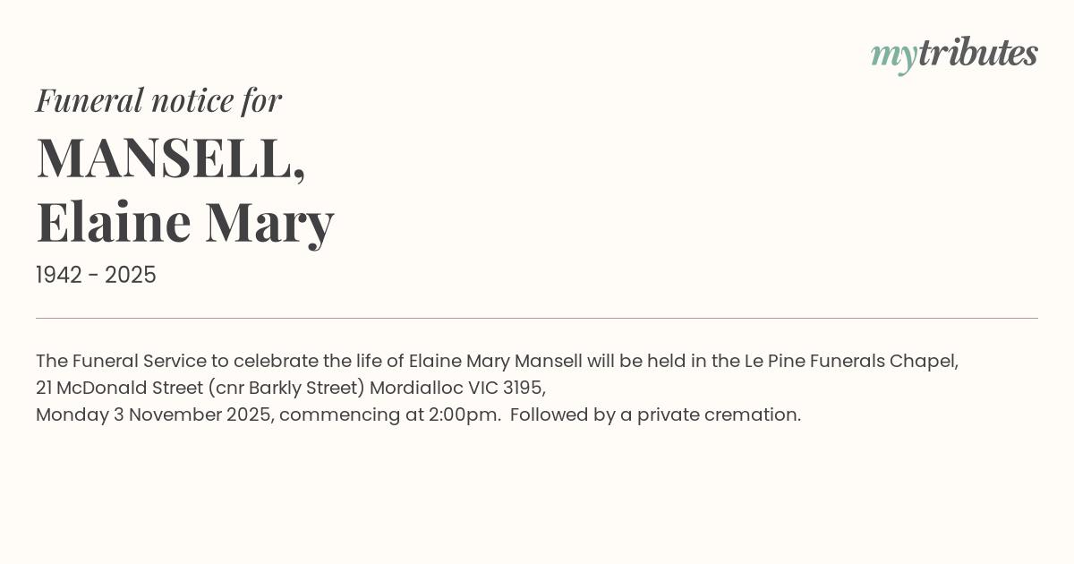 18°CThe Funeral Service to celebrate the life of Elaine Mary Mansell will be held in the Le Pine Funerals Chapel, 21 McDonald Street (cnr Barkly Street) Mordialloc VIC 3195,