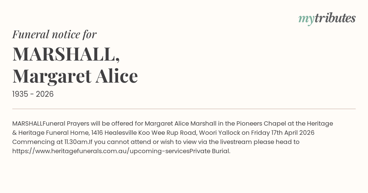 Funeral Prayers will be offered for Margaret Alice Marshall in the Pioneers Chapel at the Heritage & Heritage Funeral Home, 1416 Healesville Koo Wee Rup Road, Woori Yallock on Friday 17th April 2026 Commencing at 11.30am.