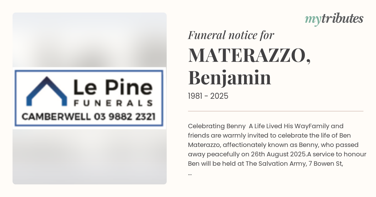 Family and friends are warmly invited to celebrate the life of Ben Materazzo, affectionately known as Benny, who passed away peacefully on 26th August 2025.