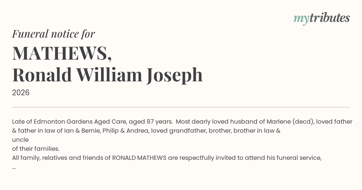 All family, relatives and friends of RONALD MATHEWS are respectfully invited to attend his funeral service, which will be held on TUESDAY MORNING 20th January 2026, commencing at 10.00am in the Chapel of Heritage Brady Funeral Directors Crematorium, 76 Maher Road, Gordonvale.