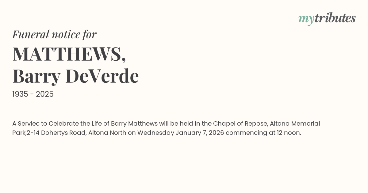 18°CA Serviec to Celebrate the Life of Barry Matthews will be held in the Chapel of Repose, Altona Memorial Park,2-14 Dohertys Road, Altona North on Wednesday January 7, 2026 commencing at 12 noon.