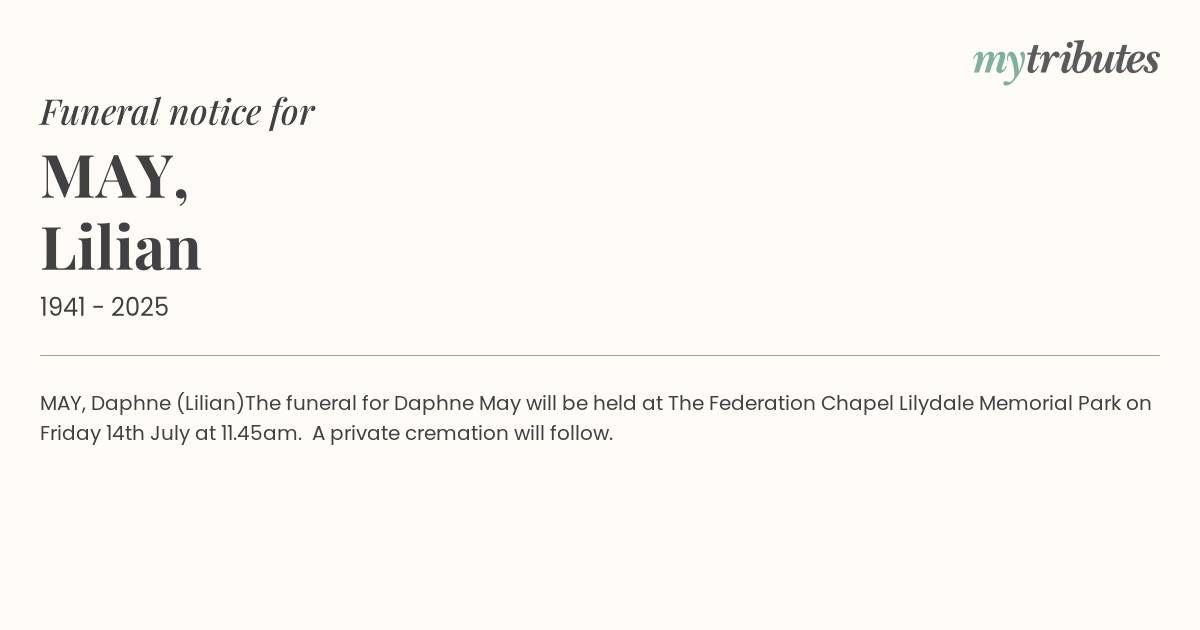 The funeral for Daphne May will be held at The Federation Chapel Lilydale Memorial Park on