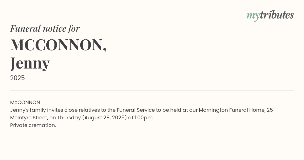 Jenny's family invites close relatives to the Funeral Service to be held at our Mornington Funeral Home, 25 McIntyre Street, on Thursday (August 28, 2025) at 1:00pm.