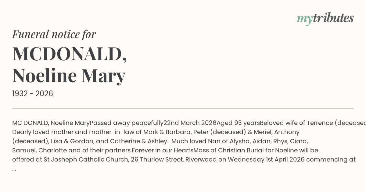 Mass of Christian Burial for Noeline will be offered at St Josheph Catholic Church, 26 Thurlow Street, Riverwood on Wednesday 1st April 2026 commencing at 10am. Following Mass, cortege will proceed to Rookwood Catholic Cemetery, Barnet Avenue, Rookwood.