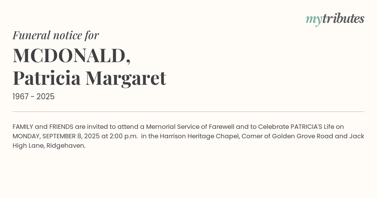 18°CFAMILY and FRIENDS are invited to attend a Memorial Service of Farewell and to Celebrate PATRICIA'S Life on MONDAY, SEPTEMBER 8, 2025 at 2:00 p.m. in the Harrison Heritage Chapel, Corner of Golden Grove Road and Jack High Lane, Ridgehaven.