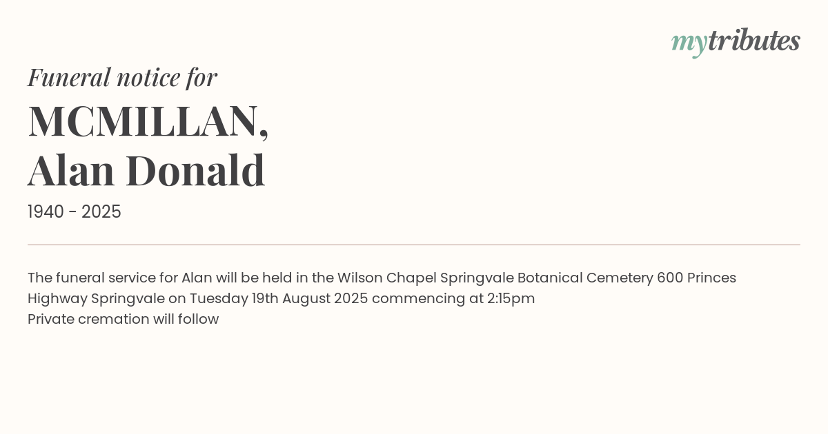 18°CThe funeral service for Alan will be held in the Wilson Chapel Springvale Botanical Cemetery 600 Princes Highway Springvale on Tuesday 19th August 2025 commencing at 2:15pm