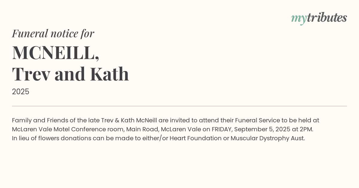 18°CFamily and Friends of the late Trev & Kath McNeill are invited to attend their Funeral Service to be held at McLaren Vale Motel Conference room, Main Road, McLaren Vale on FRIDAY, September 5, 2025 at 2PM.