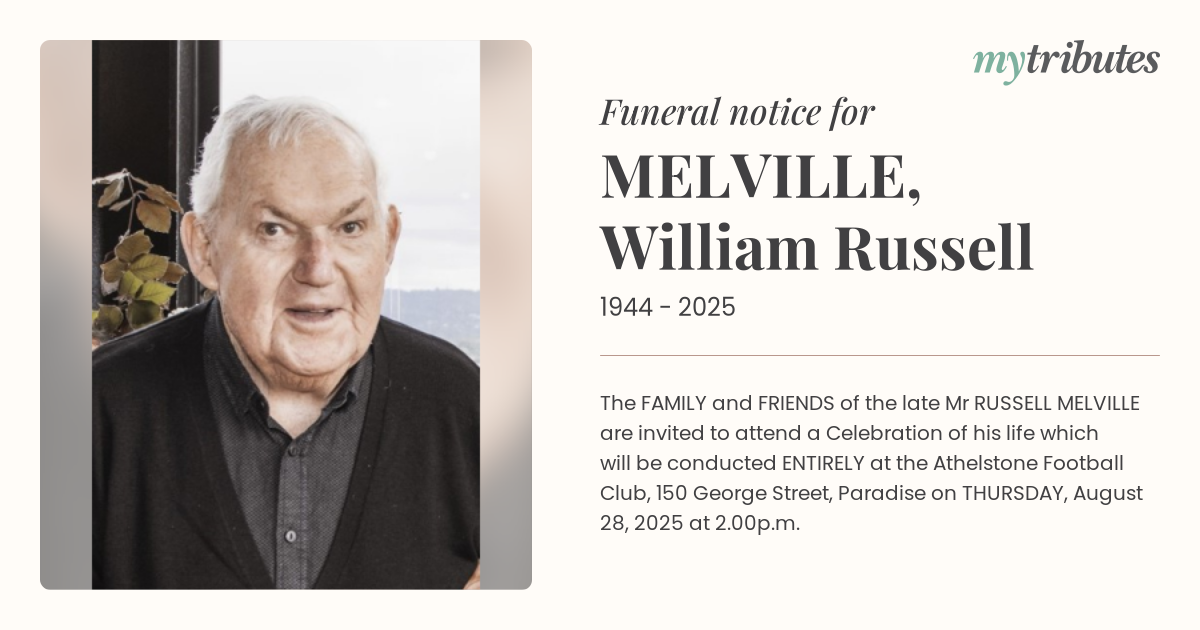 18°CThe FAMILY and FRIENDS of the late Mr RUSSELL MELVILLE are invited to attend a Celebration of his life which will be conducted ENTIRELY at the Athelstone Football Club, 150 George Street, Paradise on THURSDAY, August 28, 2025 at 2.00p.m.