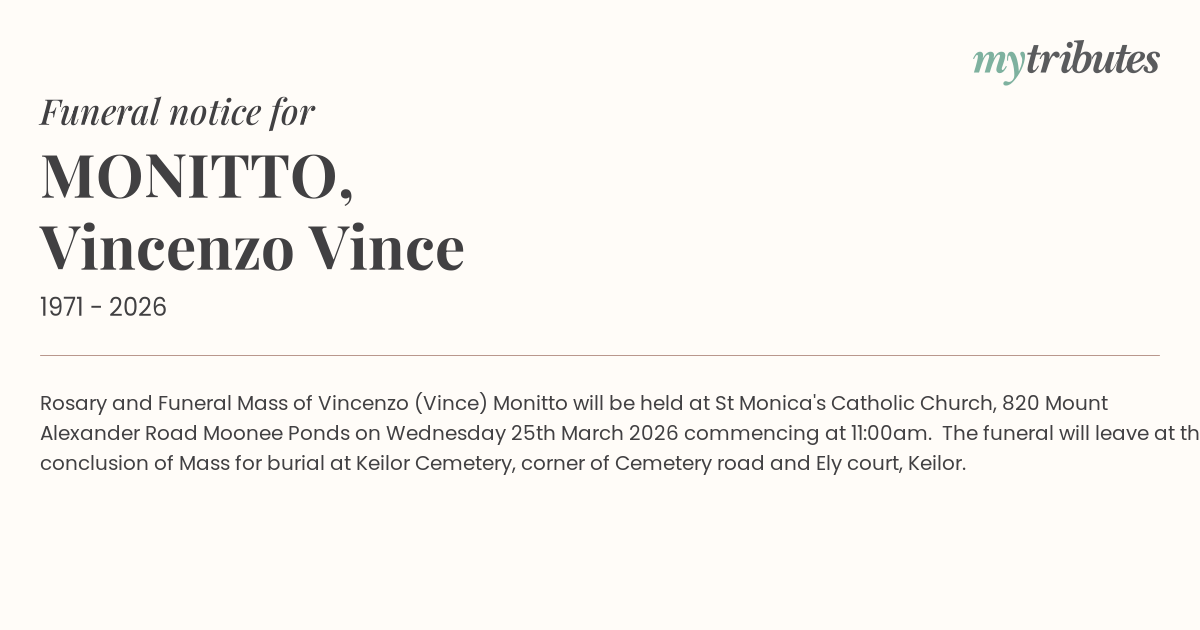 18°CRosary and Funeral Mass of Vincenzo (Vince) Monitto will be held at St Monica's Catholic Church, 820 Mount Alexander Road Moonee Ponds on Wednesday 25th March 2026 commencing at 11:00am. The funeral will leave at the conclusion of Mass for burial at Keilor Cemetery, corner of Cemetery road and Ely court, Keilor.