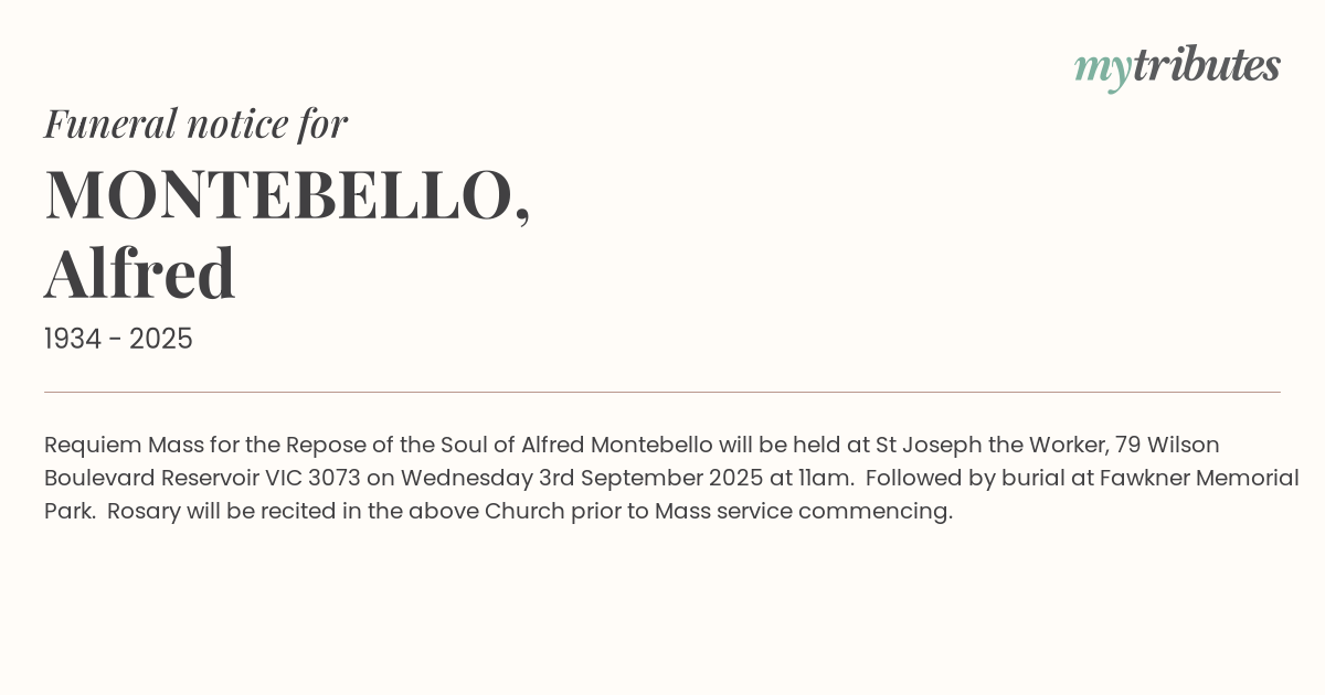 18°CRequiem Mass for the Repose of the Soul of Alfred Montebello will be held at St Joseph the Worker, 79 Wilson Boulevard Reservoir VIC 3073 on Wednesday 3rd September 2025 at 11am. Followed by burial at Fawkner Memorial Park. Rosary will be recited in the above Church prior to Mass service commencing.