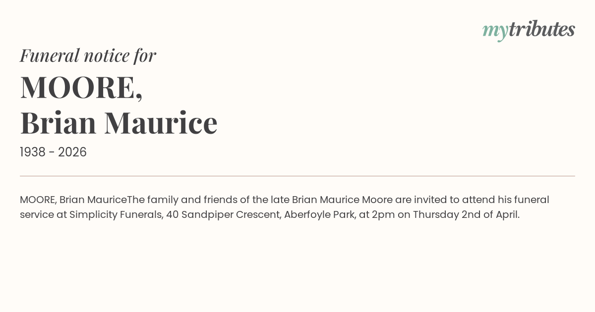 The family and friends of the late Brian Maurice Moore are invited to attend his funeral service at Simplicity Funerals, 40 Sandpiper Crescent, Aberfoyle Park, at 2pm on Thursday 2nd of April.