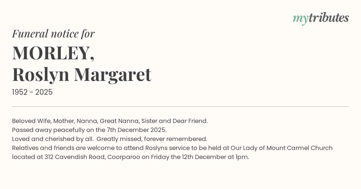 Relatives and friends are welcome to attend Roslyn’s service to be held at Our Lady of Mount Carmel Church located at 312 Cavendish Road, Coorparoo on Friday the 12th December at 1pm.