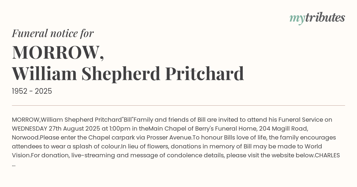 Family and friends of Bill are invited to attend his Funeral Service on WEDNESDAY 27th August 2025 at 1:00pm in the