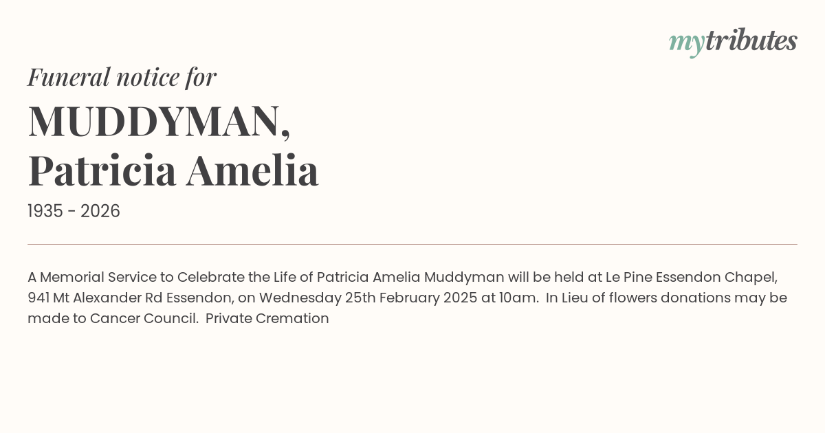 18°CA Memorial Service to Celebrate the Life of Patricia Amelia Muddyman will be held at Le Pine Essendon Chapel, 941 Mt Alexander Rd Essendon, on Wednesday 25th February 2025 at 10am. In Lieu of flowers donations may be made to Cancer Council. Private Cremation