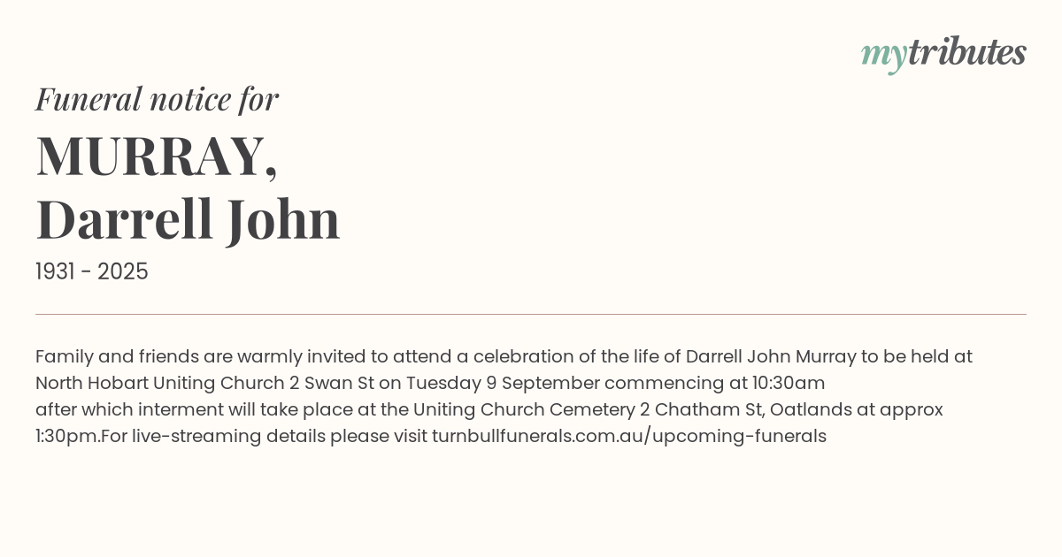 18°CFamily and friends are warmly invited to attend a celebration of the life of Darrell John Murray to be held at North Hobart Uniting Church 2 Swan St on Tuesday 9 September commencing at 10:30am after which interment will take place at the Uniting Church Cemetery 2 Chatham St, Oatlands at approx 1:30pm.