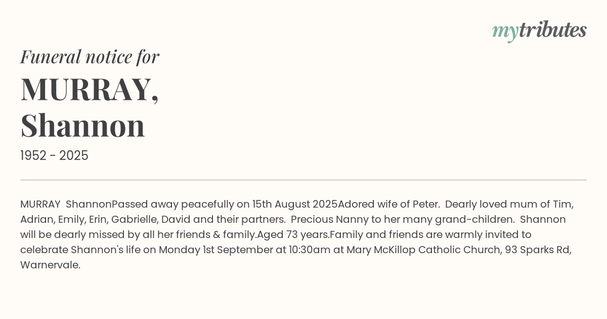 Adored wife of Peter. Dearly loved mum of Tim, Adrian, Emily, Erin, Gabrielle, David and their partners. Precious Nanny to her many grand-children. Shannon will be dearly missed by all her friends & family.