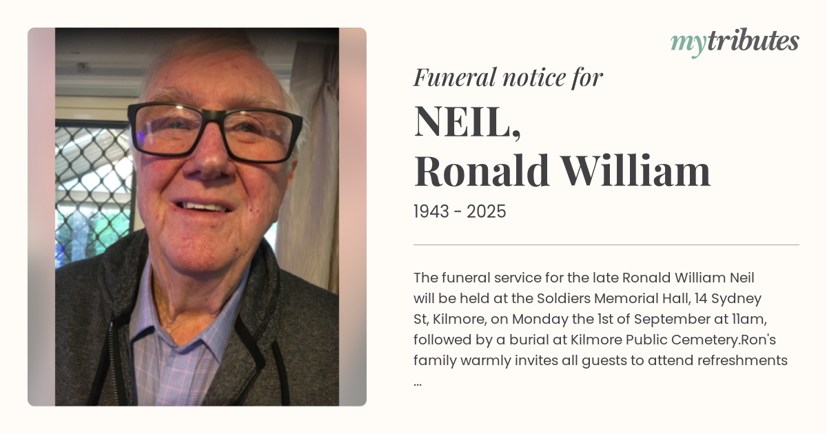 18°CThe funeral service for the late Ronald William Neil will be held at the Soldiers Memorial Hall, 14 Sydney St, Kilmore, on Monday the 1st of September at 11am, followed by a burial at Kilmore Public Cemetery.