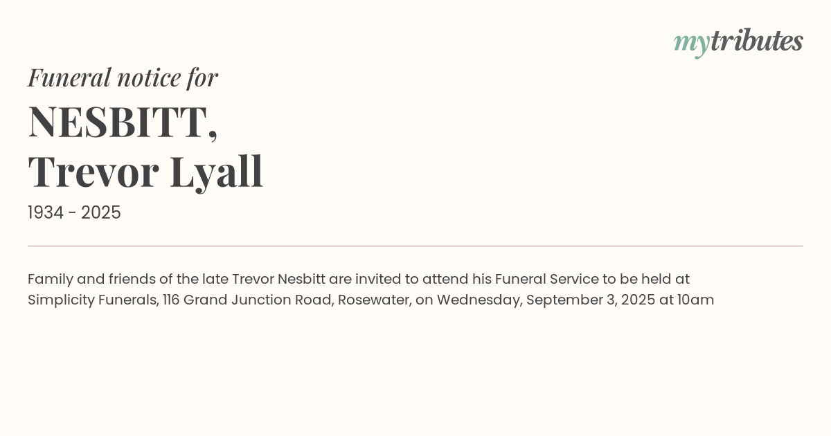 18°CFamily and friends of the late Trevor Nesbitt are invited to attend his Funeral Service to be held at Simplicity Funerals, 116 Grand Junction Road, Rosewater, on Wednesday, September 3, 2025 at 10am