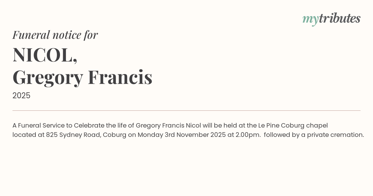 18°CA Funeral Service to Celebrate the life of Gregory Francis Nicol will be held at the Le Pine Coburg chapel located at 825 Sydney Road, Coburg on Monday 3rd November 2025 at 2.00pm. followed by a private cremation.