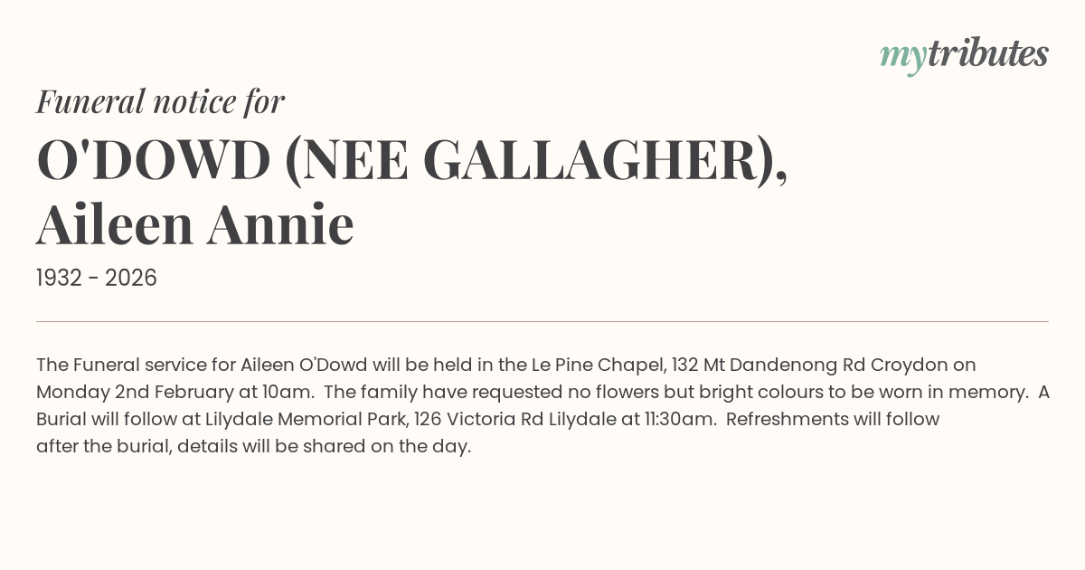 18°CThe Funeral service for Aileen O'Dowd will be held in the Le Pine Chapel, 132 Mt Dandenong Rd Croydon on Monday 2nd February at 10am. The family have requested no flowers but bright colours to be worn in memory. A Burial will follow at Lilydale Memorial Park, 126 Victoria Rd Lilydale at 11:30am. Refreshments will follow after the burial, details will be shared on the day.
