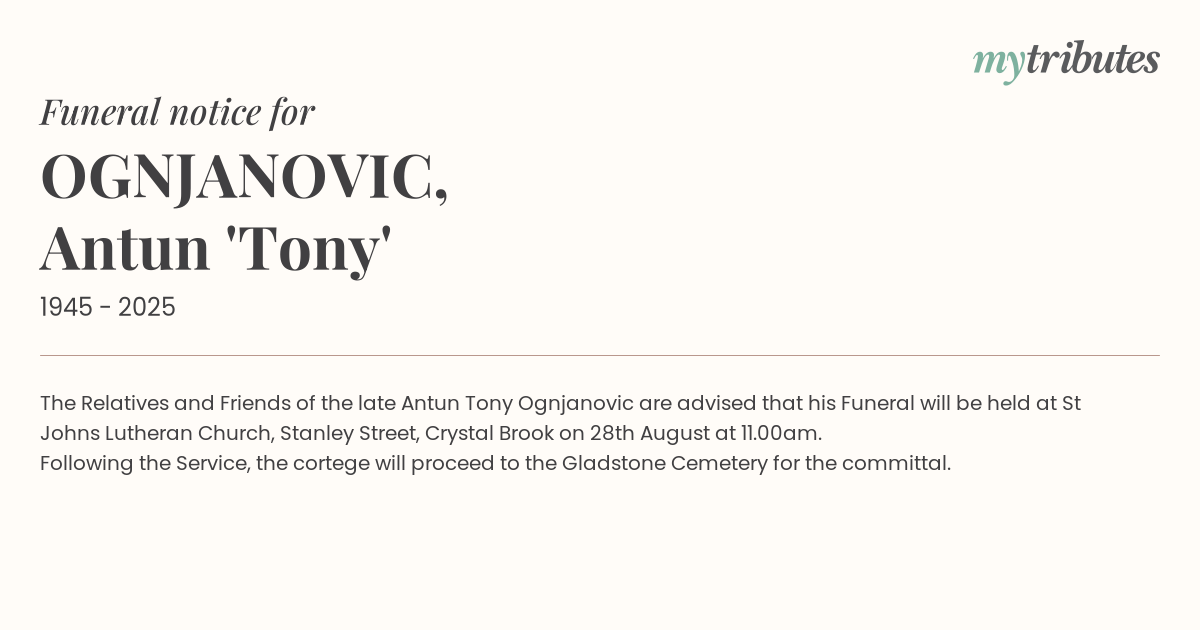 18°CThe Relatives and Friends of the late Antun ‘Tony’ Ognjanovic are advised that his Funeral will be held at St John’s Lutheran Church, Stanley Street, Crystal Brook on 28th August at 11.00am.