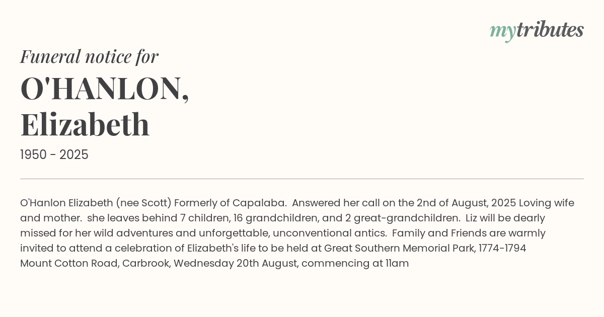 18°CO'Hanlon Elizabeth (nee Scott) Formerly of Capalaba. Answered her call on the 2nd of August, 2025 Loving wife and mother. she leaves behind 7 children, 16 grandchildren, and 2 great-grandchildren. Liz will be dearly missed for her wild adventures and unforgettable, unconventional antics. Family and Friends are warmly invited to attend a celebration of Elizabeth's life to be held at Great Southern Memorial Park, 1774-1794 Mount Cotton Road, Carbrook, Wednesday 20th August, commencing at 11am