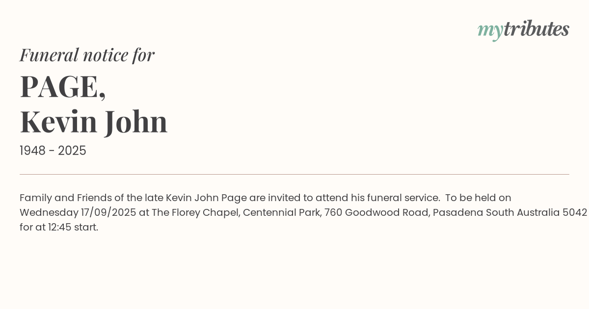 18°CFamily and Friends of the late Kevin John Page are invited to attend his funeral service. To be held on Wednesday 17/09/2025 at The Florey Chapel, Centennial Park, 760 Goodwood Road, Pasadena South Australia 5042 for at 12:45 start.