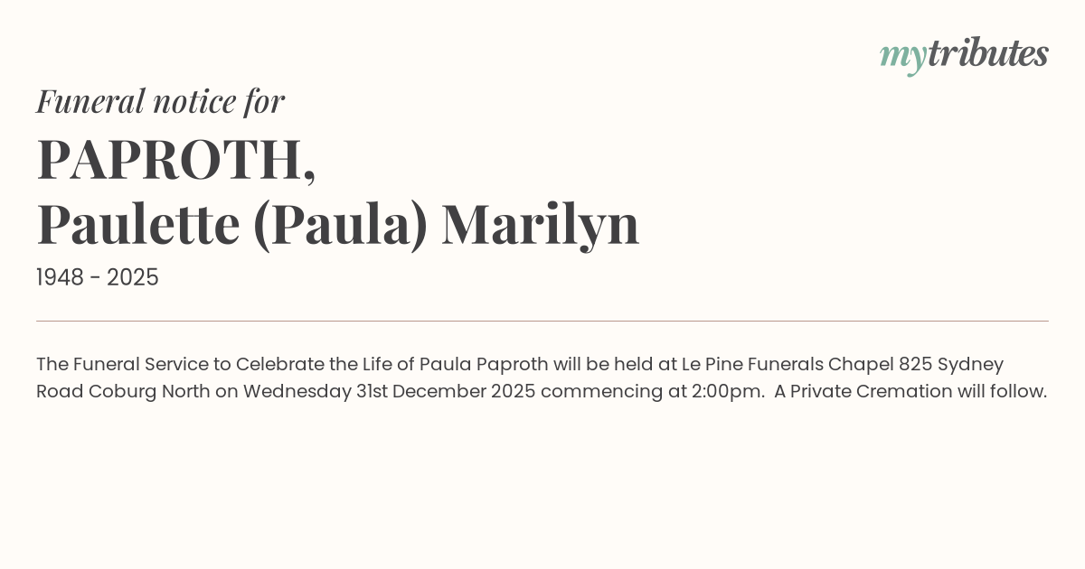 18°CThe Funeral Service to Celebrate the Life of Paula Paproth will be held at Le Pine Funerals Chapel 825 Sydney Road Coburg North on Wednesday 31st December 2025 commencing at 2:00pm. A Private Cremation will follow.