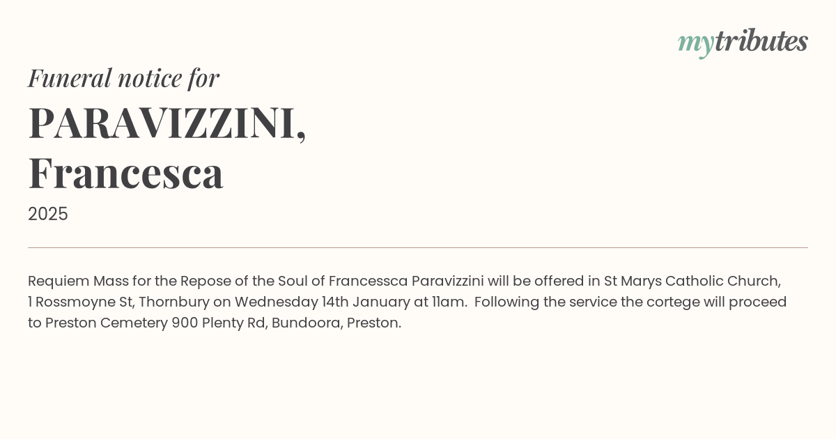 18°CRequiem Mass for the Repose of the Soul of Francessca Paravizzini will be offered in St Mary’s Catholic Church, 1 Rossmoyne St, Thornbury on Wednesday 14th January at 11am. Following the service the cortege will proceed to Preston Cemetery 900 Plenty Rd, Bundoora, Preston.