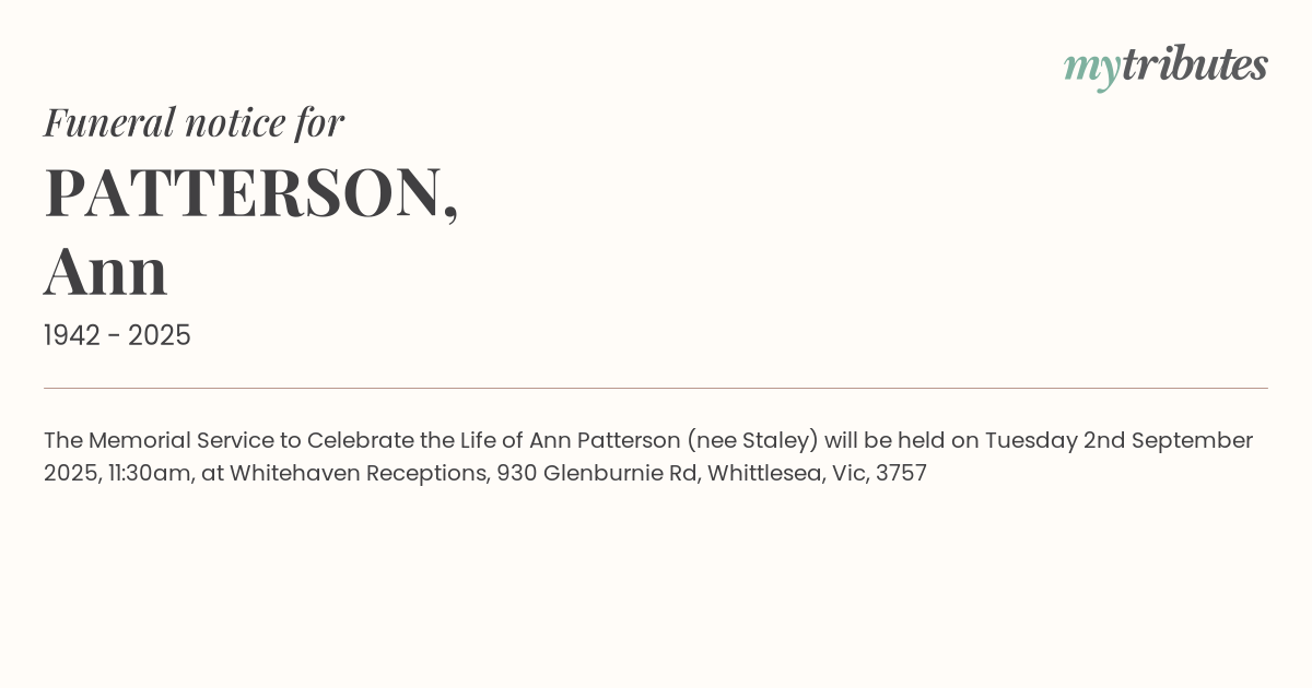 18°CThe Memorial Service to Celebrate the Life of Ann Patterson (nee Staley) will be held on Tuesday 2nd September 2025, 11:30am, at Whitehaven Receptions, 930 Glenburnie Rd, Whittlesea, Vic, 3757