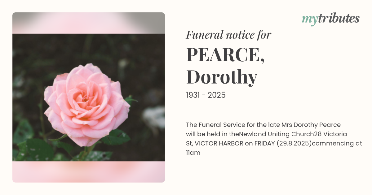 18°CThe Funeral Service for the late Mrs Dorothy Pearce will be held in the Newland Uniting Church 28 Victoria St, VICTOR HARBOR on FRIDAY (29.8.2025) commencing at 11am