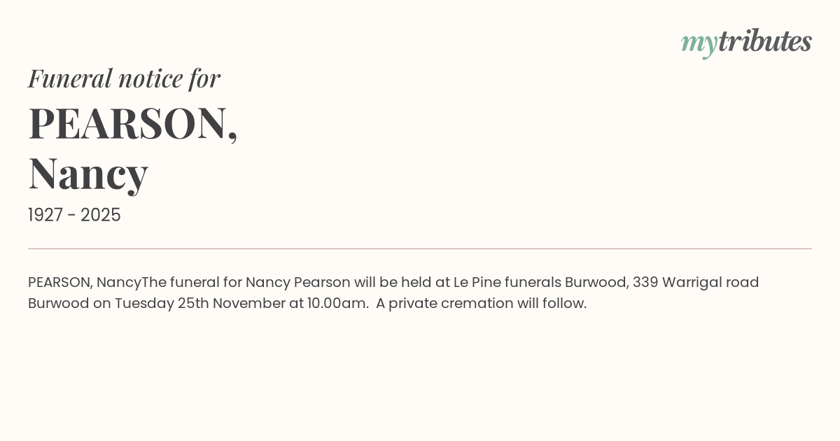 The funeral for Nancy Pearson will be held at Le Pine funerals Burwood, 339 Warrigal road Burwood on