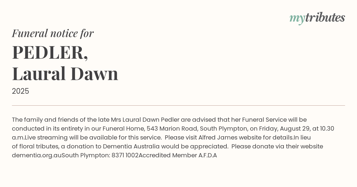 18°CThe family and friends of the late Mrs Laural Dawn Pedler are advised that her Funeral Service will be conducted in its entirety in our Funeral Home, 543 Marion Road, South Plympton, on Friday, August 29, at 10.30 a.m.