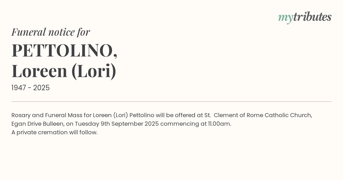 18°CRosary and Funeral Mass for Loreen (Lori) Pettolino will be offered at St. Clement of Rome Catholic Church, Egan Drive Bulleen, on Tuesday 9th September 2025 commencing at 11.00am.