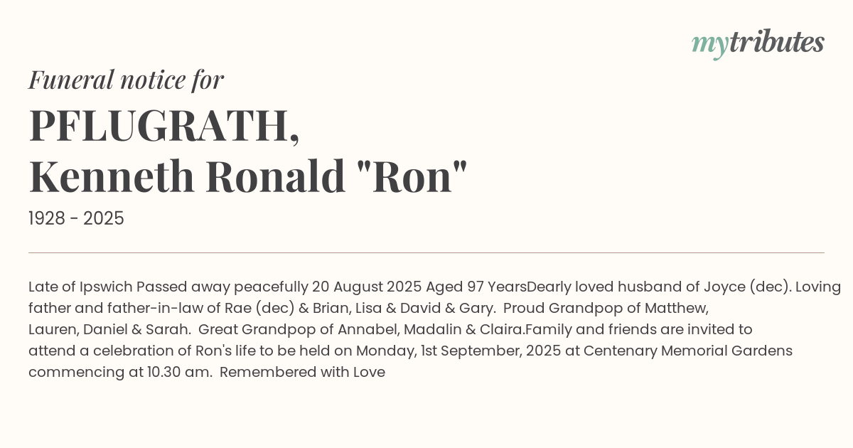 Family and friends are invited to attend a celebration of Ron's life to be held on Monday, 1st September, 2025 at Centenary Memorial Gardens commencing at 10.30 am.