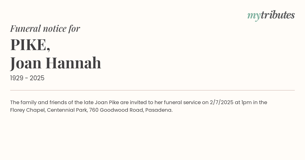 18°CThe family and friends of the late Joan Pike are invited to her funeral service on 2/7/2025 at 1pm in the Florey Chapel, Centennial Park, 760 Goodwood Road, Pasadena.