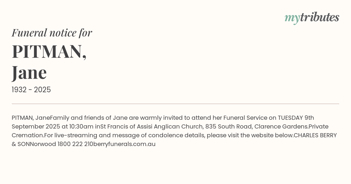 Family and friends of Jane are warmly invited to attend her Funeral Service on TUESDAY 9th September 2025 at 10:30am in