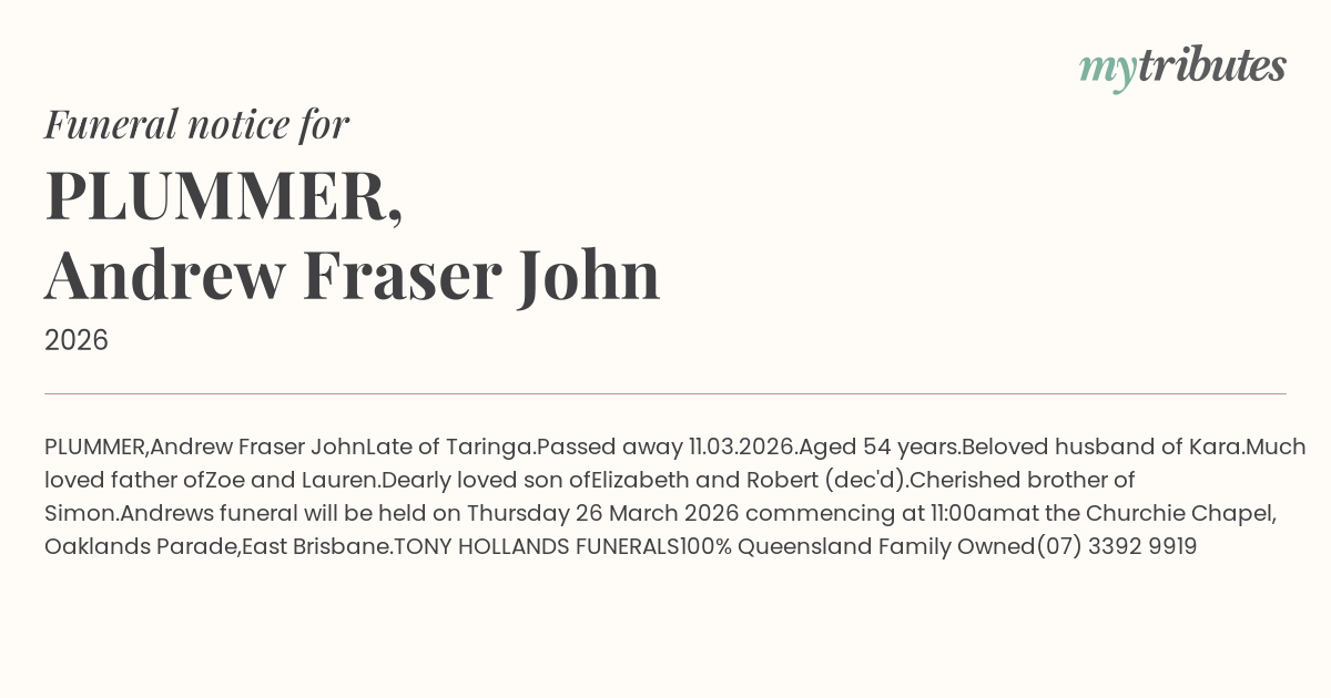 Andrew’s funeral will be held on Thursday 26 March 2026 commencing at 11:00am