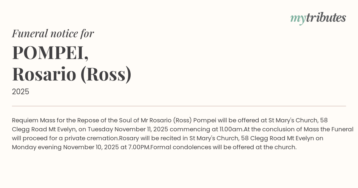 18°CRequiem Mass for the Repose of the Soul of Mr Rosario (Ross) Pompei will be offered at St Mary's Church, 58 Clegg Road Mt Evelyn, on Tuesday November 11, 2025 commencing at 11.00am.