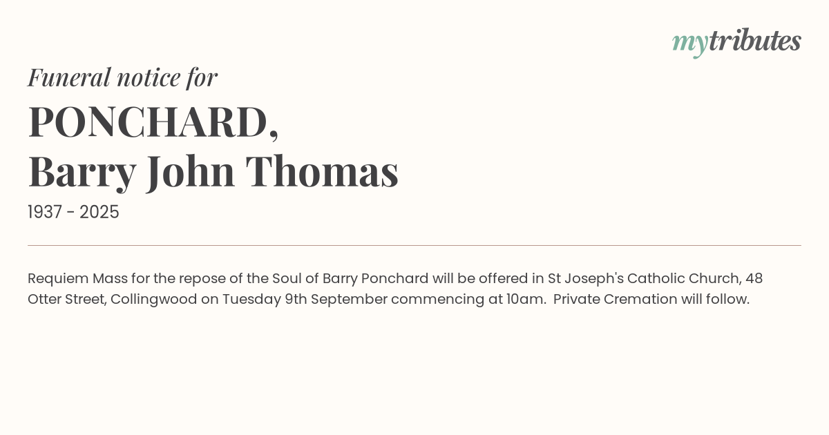 18°CRequiem Mass for the repose of the Soul of Barry Ponchard will be offered in St Joseph's Catholic Church, 48 Otter Street, Collingwood on Tuesday 9th September commencing at 10am. Private Cremation will follow.