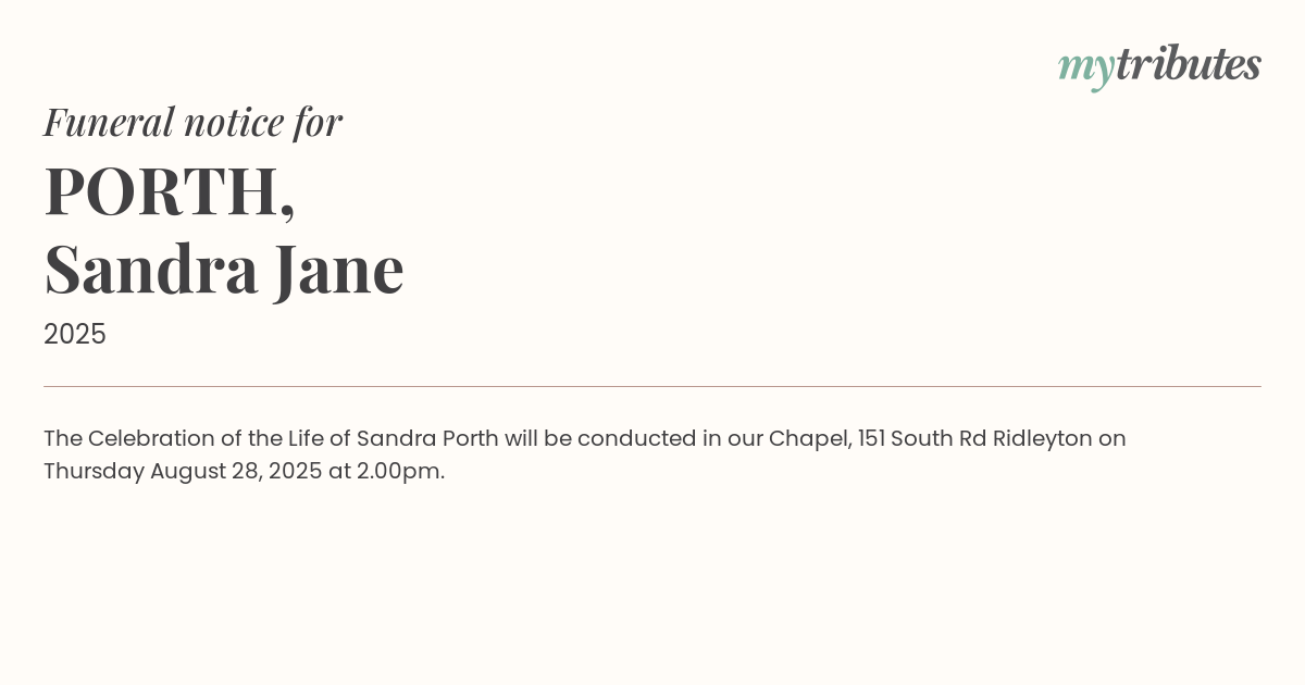 18°CThe Celebration of the Life of Sandra Porth will be conducted in our Chapel, 151 South Rd Ridleyton on Thursday August 28, 2025 at 2.00pm.