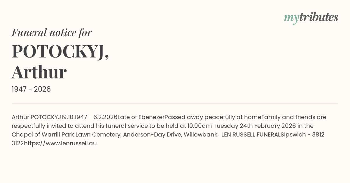 Family and friends are respectfully invited to attend his funeral service to be held at 10.00am Tuesday 24th February 2026 in the Chapel of Warrill Park Lawn Cemetery, Anderson-Day Drive, Willowbank.