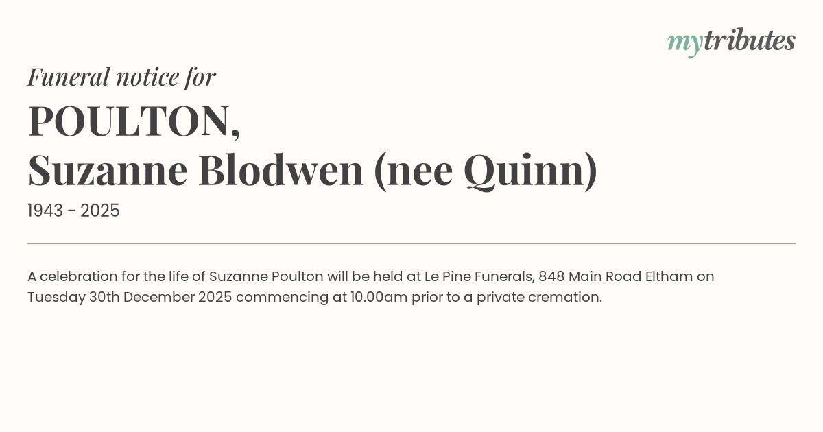 18°CA celebration for the life of Suzanne Poulton will be held at Le Pine Funerals, 848 Main Road Eltham on Tuesday 30th December 2025 commencing at 10.00am prior to a private cremation.